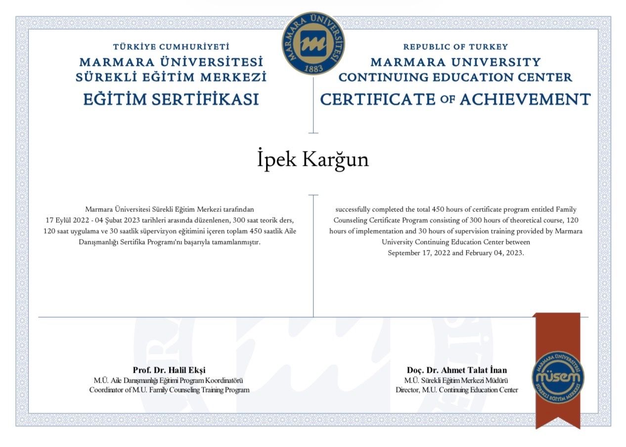 Merhaba, ben Uzman Klinik Psikolog İpek Karğun. Lisans eğitimimi Acıbadem Üniversitesi Psikoloji bölümünde tamamladım; ardından İstanbul Nişantaşı Üniversitesi Klinik Psikoloji Yüksek Lisans (Tezli) programından mezun oldum. Mesleki gelişimimi klinik saha deneyimleri ve ek eğitimlerle destekleyerek danışanlarıma bilimsel temelli bir çerçevede psikolojik destek sunuyorum.